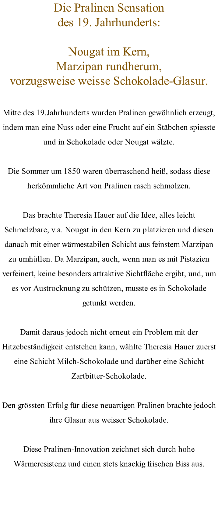 brachte Theresia Hauer auf die Idee Nougat in den Kern zu platzieren und diesen mit einer wärmestabilen Schicht aus feinstem Marzipan zu umhüllen. Diese Pralinen-Innovation ergibt hohe Wärmeresistenz und einen stets knackig frischen Biss.