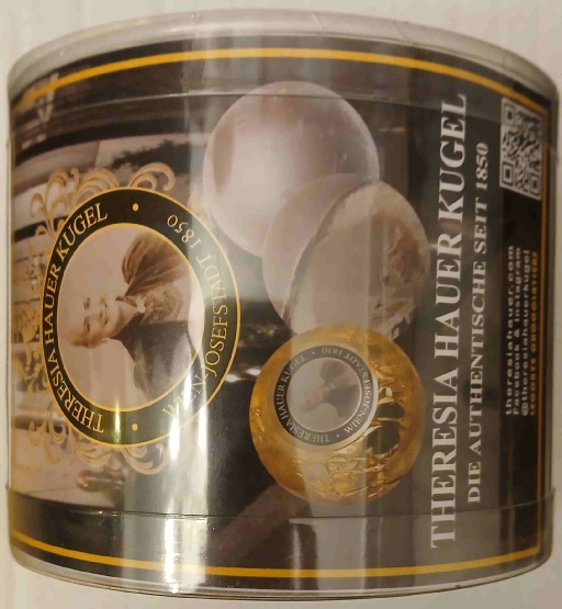 Schokolade-Pralinen gefüllt mit einem Kern aus Nougatcrème (34%), eingebettet in Marzipan (41%), umhüllt von Schokolade, stannioliert.